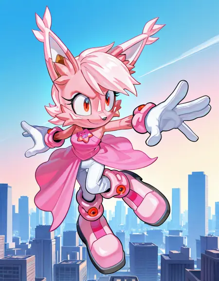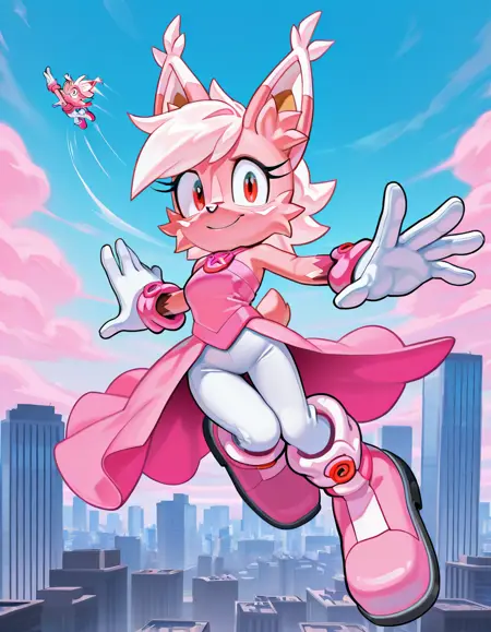 overclocked nicole the lynx, red eyes, star brooch, white gloves, pink high-low dress, white pants, pink white boots