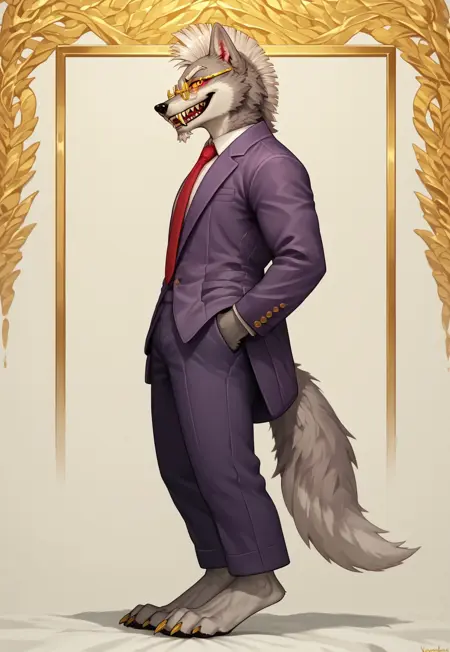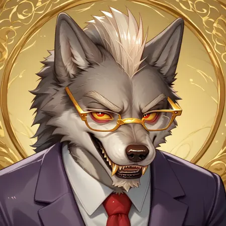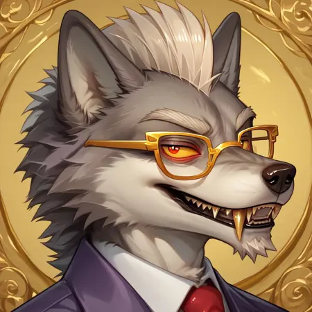 외모: 연한 회색 털, 흰색 모하awk, 날카로운 이빨, 늑대, 긴 흰색 수염, 붉은 홍채, 노란 공막, 흰색 퐁퐁 눈썹, 근육질