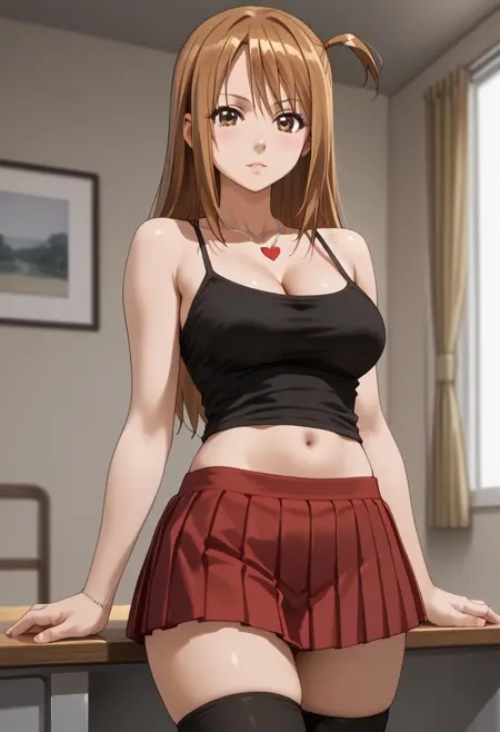 SK_C, ジュエリー, ネックレス, ハートネックレス, 胸元, お腹の部分, サイハイソックス, 赤いスカート, へそ, プリーツスカート, スパゲッティストラップ, タンクトップ, 黒いシャツ, カミソール,