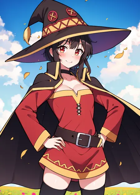 推荐提示词(若想更贴近原角色):megumin_konosuba, 1girl, (((solo))), ((brown hair)), witch, witch hat, belt, brown belt, red eyes, red dress, choker, (((cape))), ((black cape)), long sleeves, long legs, (((two arms))), (((two hands))), ((thighs)), off shoulder, bandages thighhighs, black thighhighs