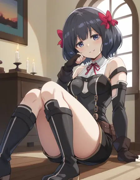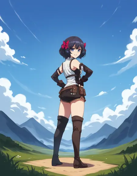 提示词: shade, black_hair, short_hair, blue_eyes, bow, ribbon, hair_bow, thighhighs, shorts, black_gloves, belt, fingerless_gloves, black_shorts, thigh_boots