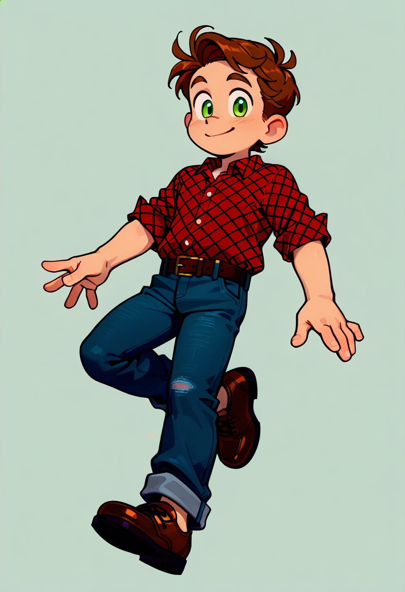 ZéBetoTDM, 1boy, green eyes, spiky brown hair, red plaid striped shirt, blue jeans, belt, brown shoes
