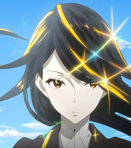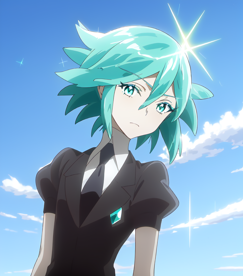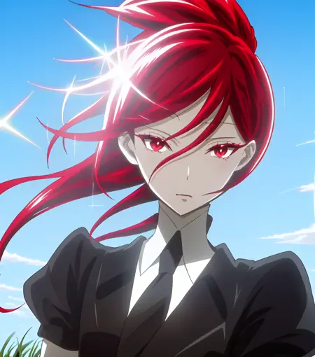 white shirt, collar, necktie, black jacket, short puffy sleeves, belt, black shorts