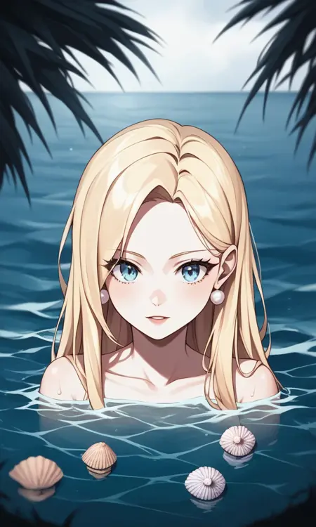 Ocean Academia,Black, dark shades of blue, violet, grey, green,seashell,bioluminescence, pearls,foggy beach