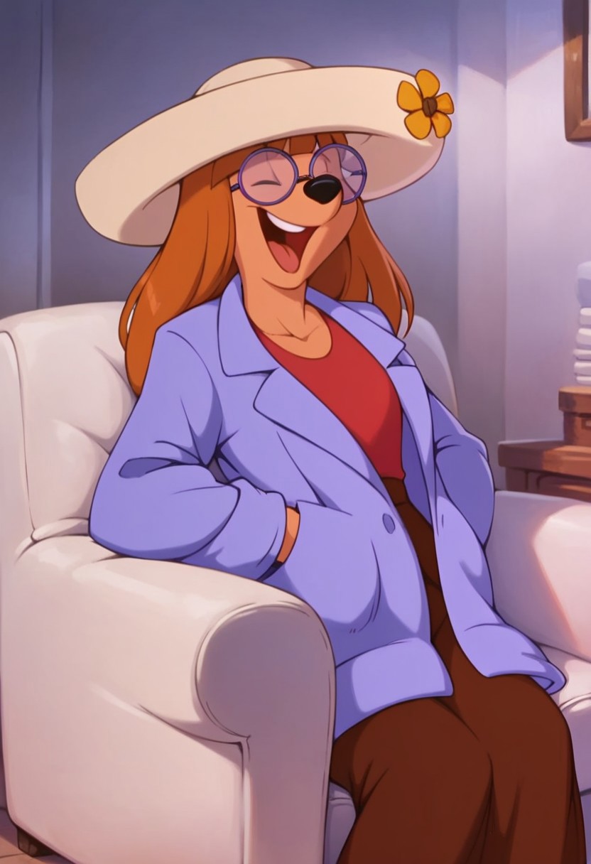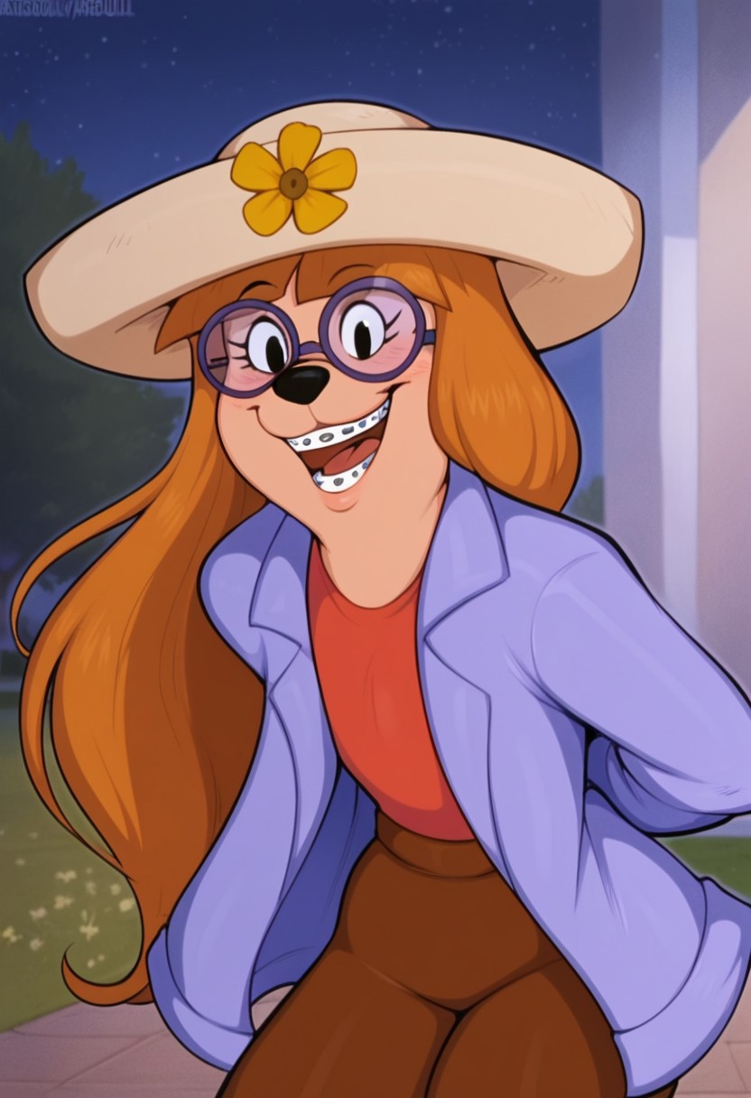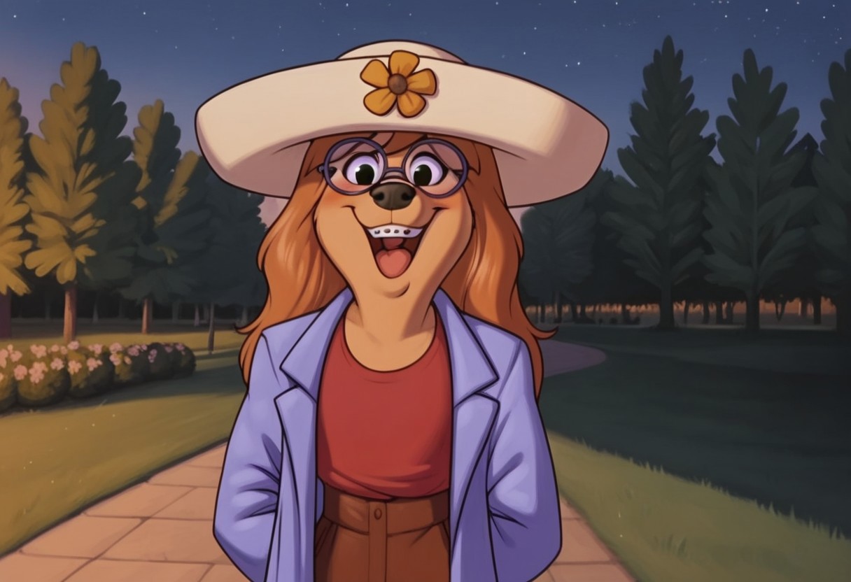 ポジティブプロンプト:StaceyGM、フューリー、アンスロ、雌性犬、矯正歯科装置、紫の丸眼鏡、黒い鼻、黒い目、オレンジ色の髪、長い髪、白い帽子、帽子に花、紫のジャケット、長いジャケット、赤いシャツ、茶色のズボン