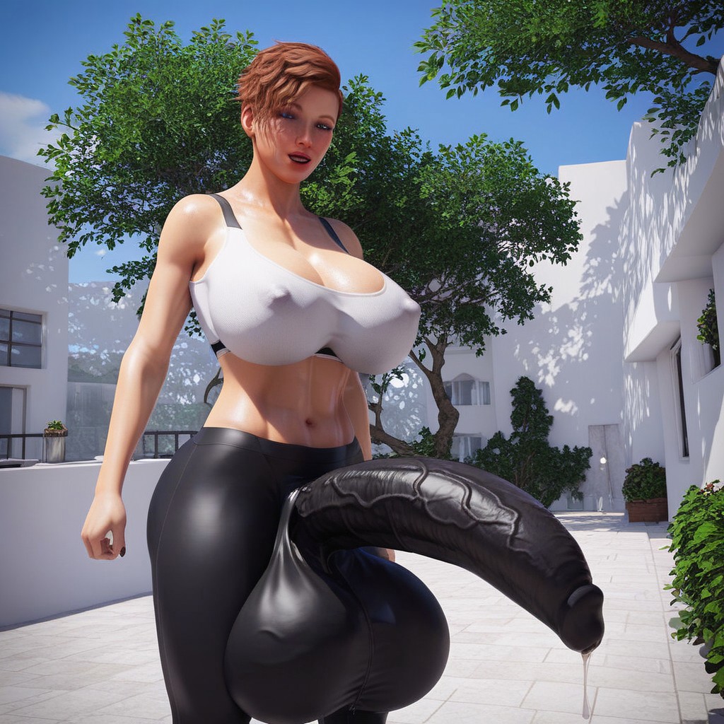 1girl, solo, huge breasts, blue eyes, sports bra, futanari, curved penis, gigantic penis, tomboy, lips, nipples, gigantic testicles,