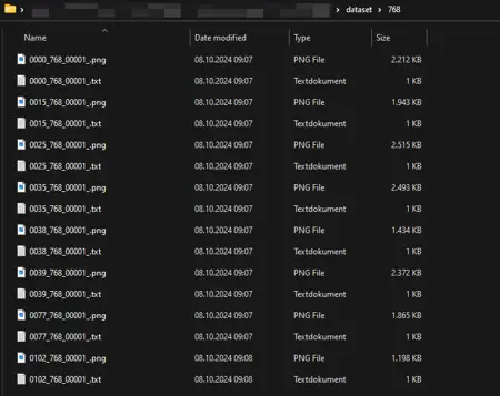 4. Start the run. All processed images are saved in the subfolder “/dataset/[resolution]/ with the configured zero_padding and resolution as name, as png and the caption as txt.