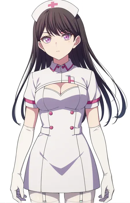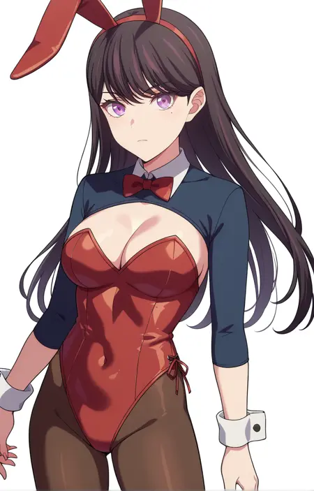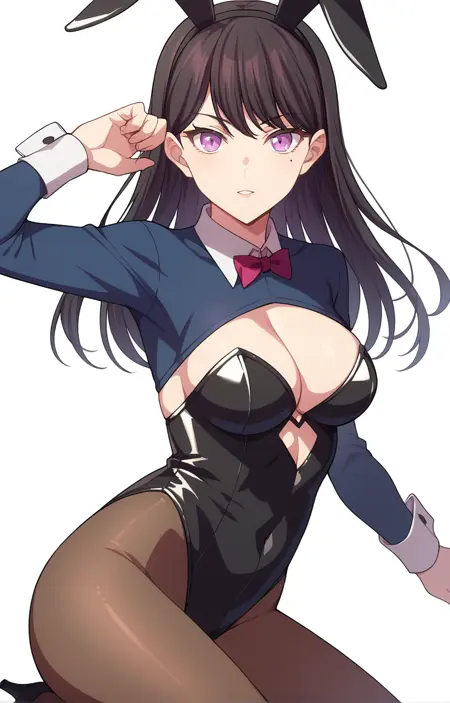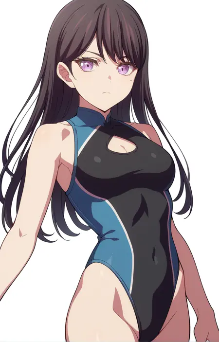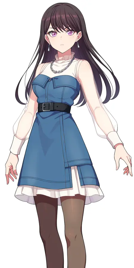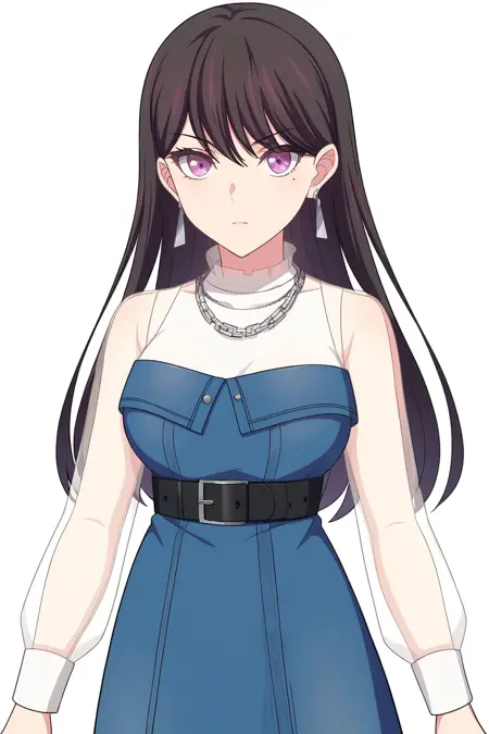 触发词:live服:shiina taki,black hair,purple eyes,mole under eye,long hair,earrings, necklace, see-through,bangclothes, blue dress, black belt, long sleeves, see-through sleeves,pantyhose,socks