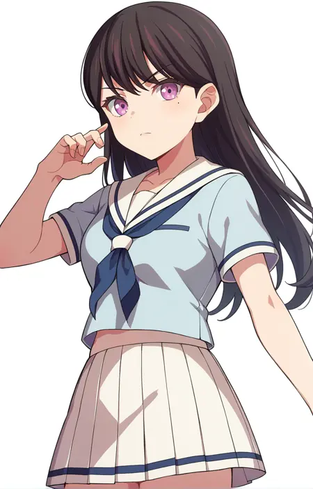 Summer School Uniform: shiina taki, black hair, purple eyes, mole under eye, long hair, serafuku, hanasakigawa summer school uniform, white sailor collar, white skirt, pleated skirt, short sleeves, blue neckerchief.
