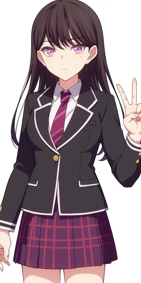 中学校服:shiina taki,black hair,purple eyes,mole under eye,long hair,middle school uniform, purple necktie, white shirt, black jacket,purple skirt, plaid skirt,pleated skirt,