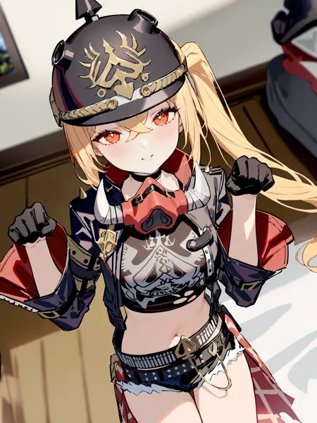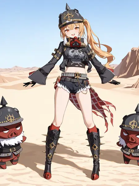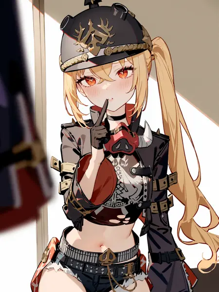 (Version 1.0)Additional prompts for her default in-game costume: side ponytail, knee boots, red socks, black helmet, cutoffs, half gloves, high belt, cropped jacket, mask around neck, black camisole, sarong