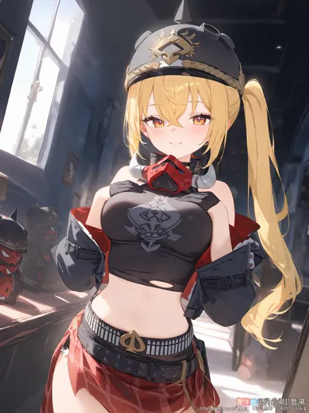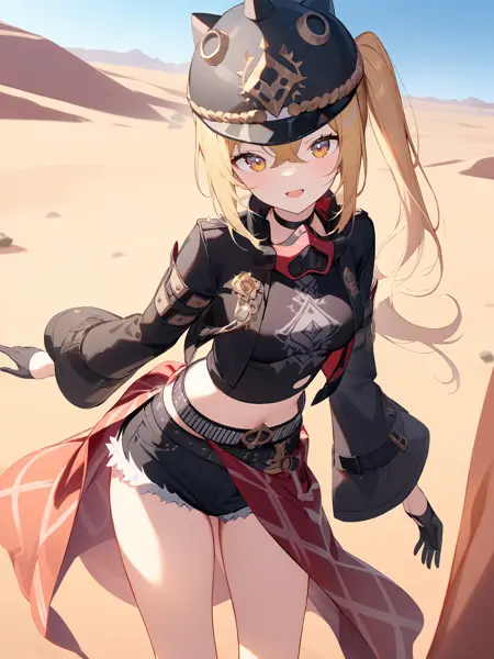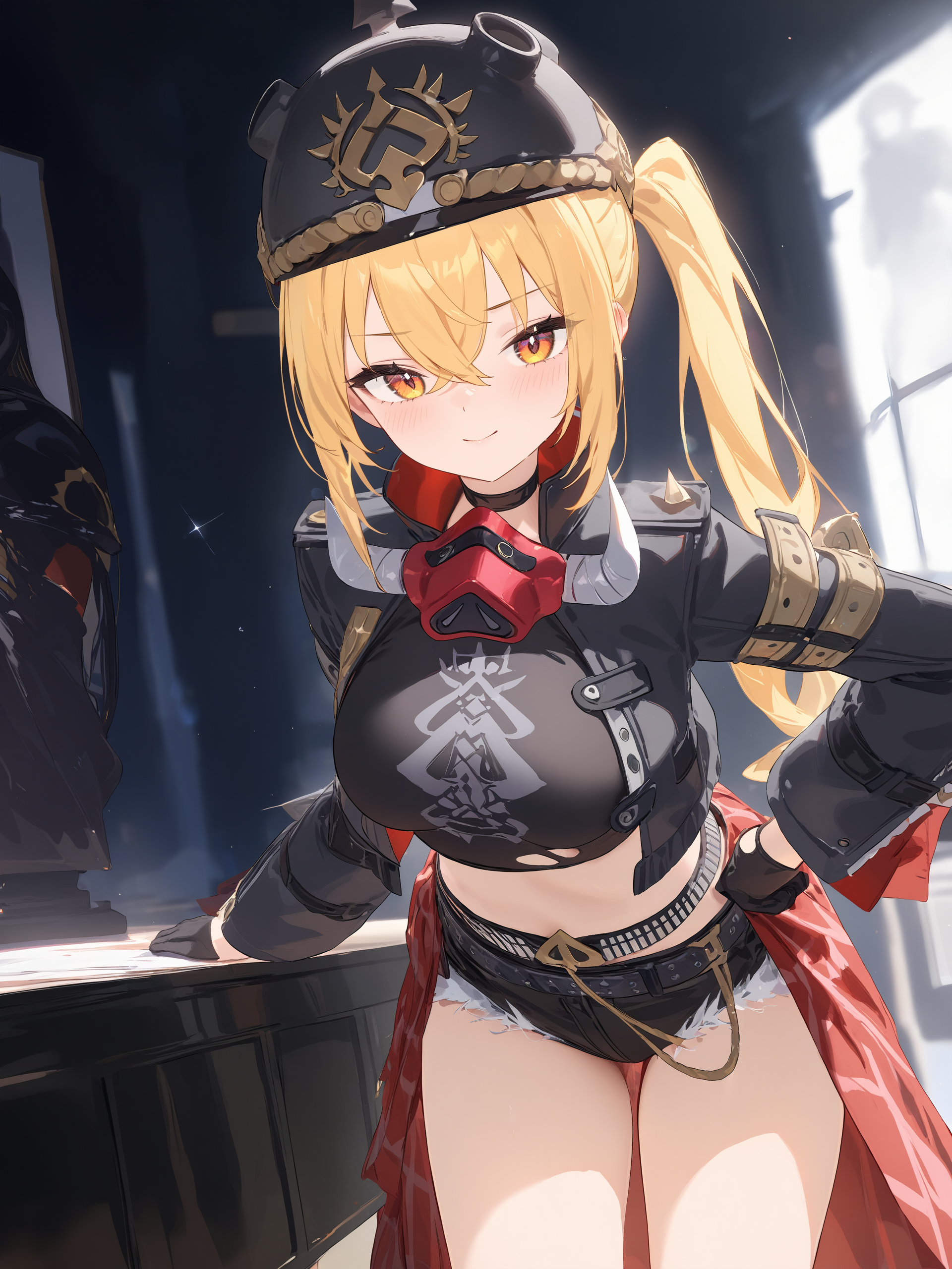 (버전 1.0) 기본 게임 의상 추가 프롬프트: 사이드 폰테일, 무릎 부츠, 빨간 양말, 검정 헬멧, 컷오프스, 반장갑, 높은 벨트, 크롭 재킷, 목 주변 마스크, 검정 카미솔, 사롱