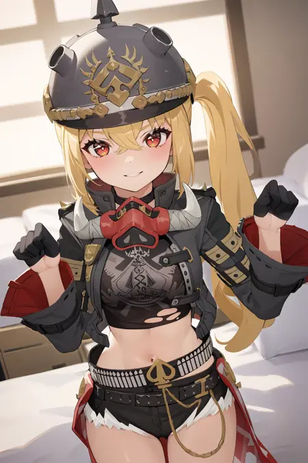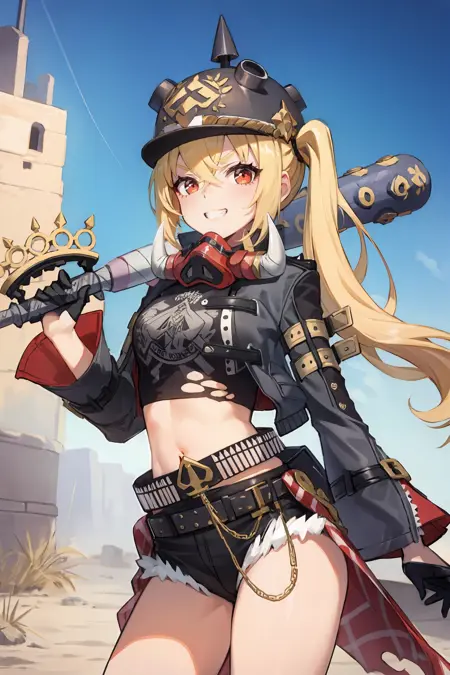 (バージョン 1.0)ゲーム内デフォルト衣装用追加プロンプト:サイドポニテール、膝上ブーツ、赤色ソックス、黒色ヘルメット、カットオフズ、ハーフグローブ、ハイベルト、短めのジャケット、首周りのマスク、黒色カーマイソール、サロング