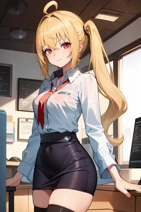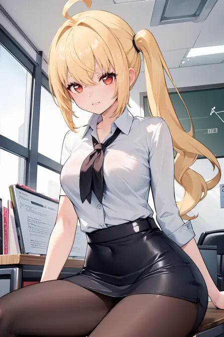 (バージョン 2.0)ゲーム内デフォルト衣装用追加プロンプト:サイドポニテール、黒色ヘルメット、首周りのマスク、ハーフグローブ、ハイベルト、黒色短めのジャケット、黒色カーマイソール、黒色カットオフズ、サロング、黒色膝上ブーツ、赤色膝丈ソックス