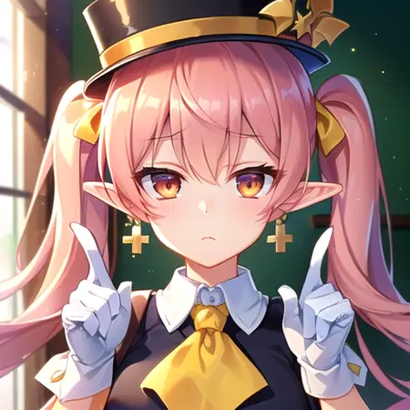 Trigger Words: Dolce, brown eyes, pointy ears, top hat, red dress, white gloves, yellow necktie, earrings, pink hair, twintails, long hair (expressionless is also a good tag to add for her usual expressionless demeanor in game)