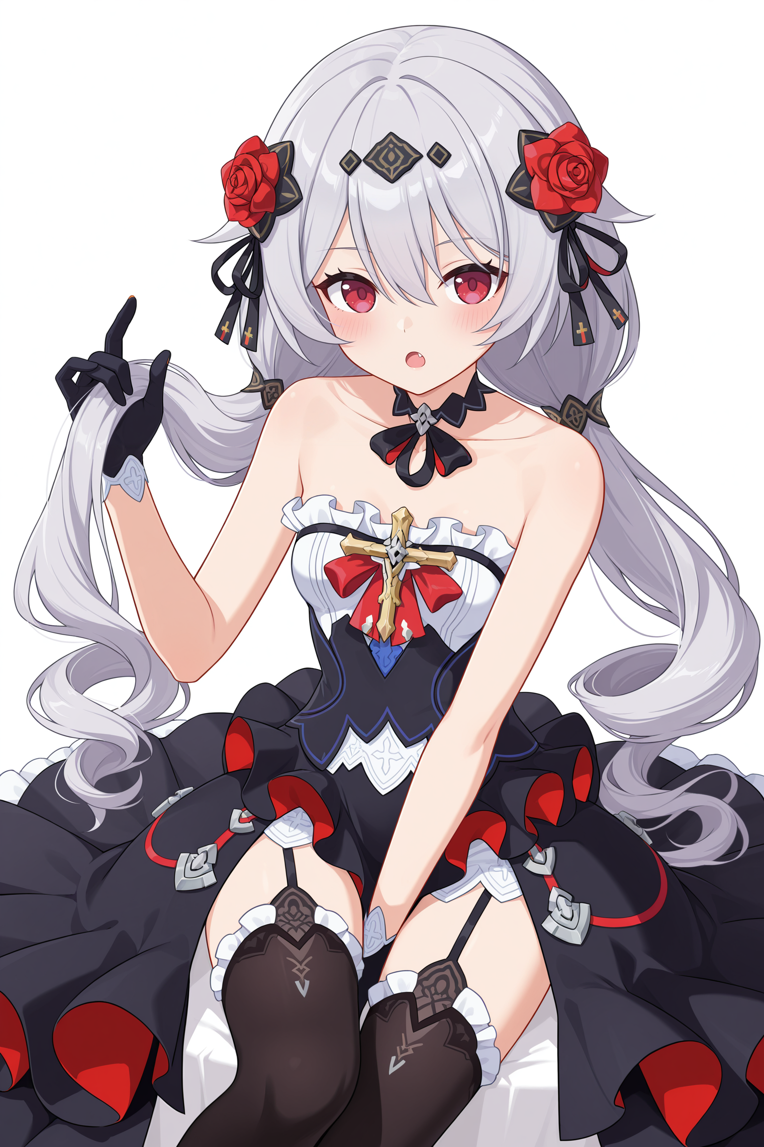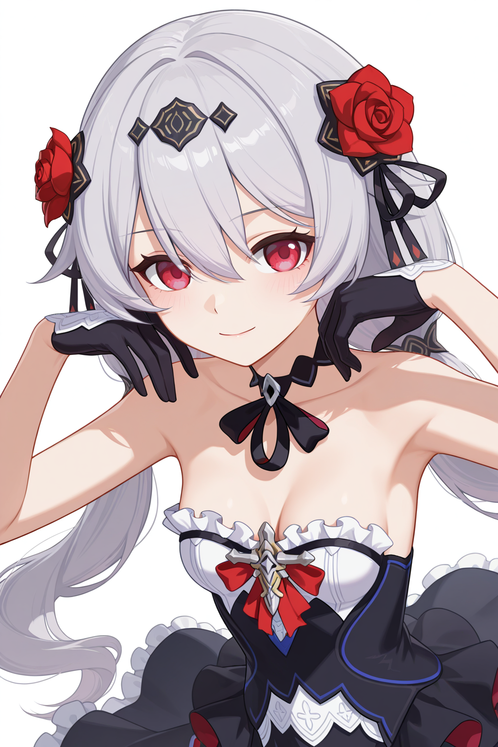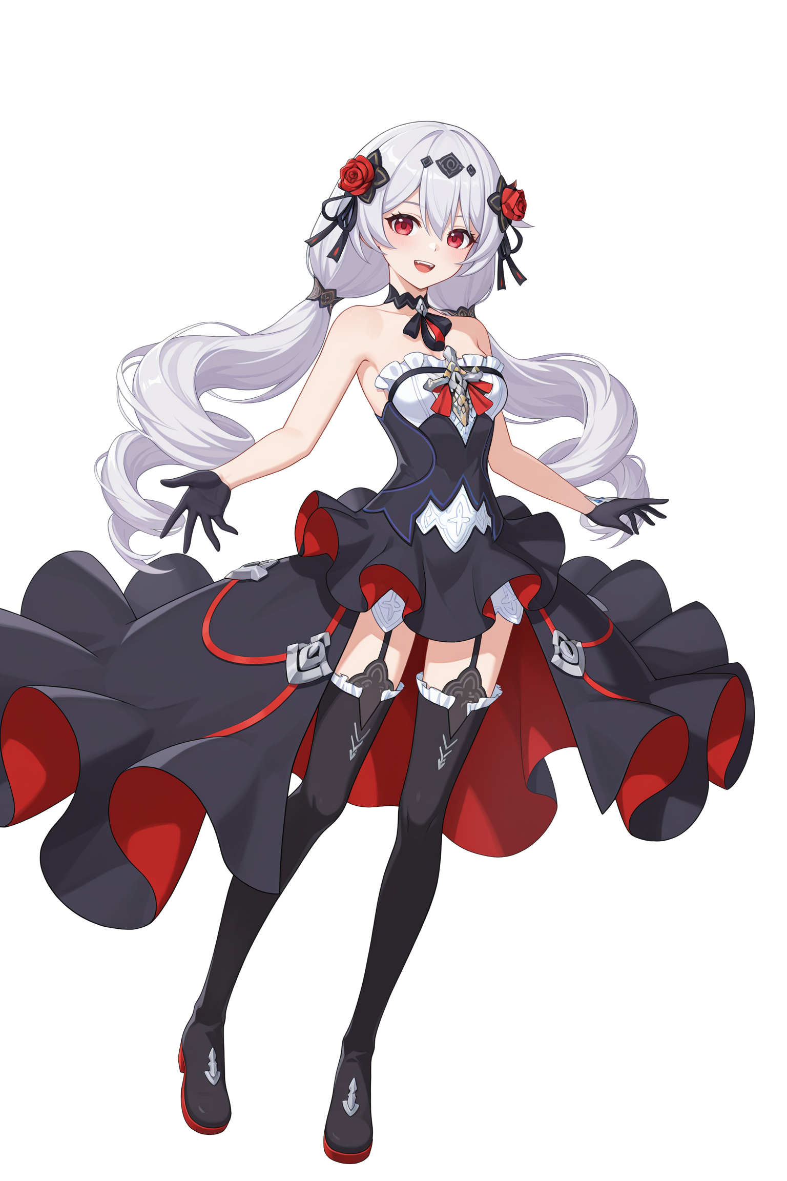 hair flower,thigh boots,red rose,black dress,black gloves,black footwear,strapless dress,black thighhighs,choker,
