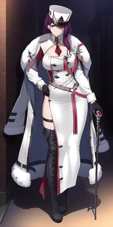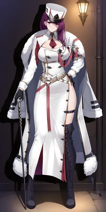 衣装タグ: "hat, gloves, necktie, white headwear, black gloves, fur trim, uniform, white cape, cleavage, white military uniform, military hat, white coat, black footwear, boots"