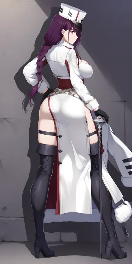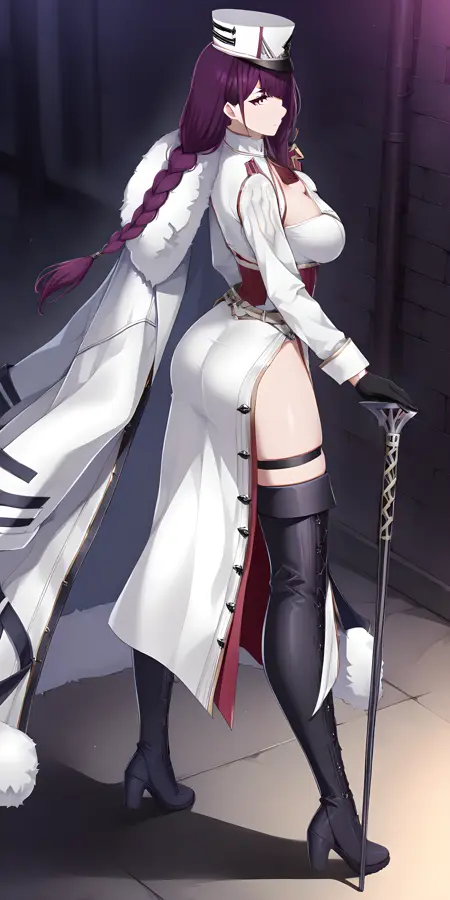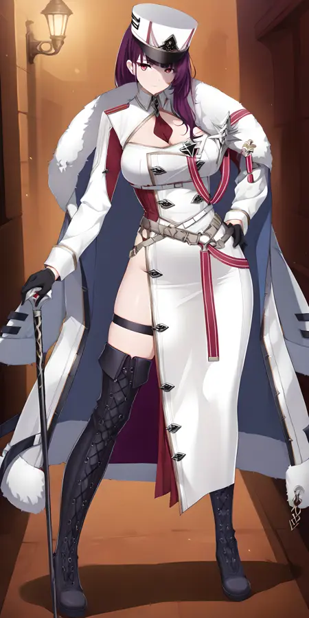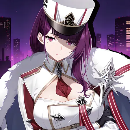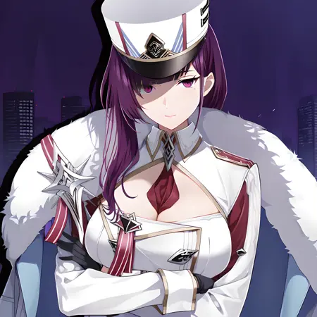 激活标签为:“felix(counterside), 长发, 眼下痣, 紫发, 紫眼, 大胸”,服装标签为:“帽子、手套、领带、白色头饰、黑色手套、毛皮镶边、制服、白色斗篷、露胸、白色军服、军帽、白色外套、黑色鞋履、靴子”。