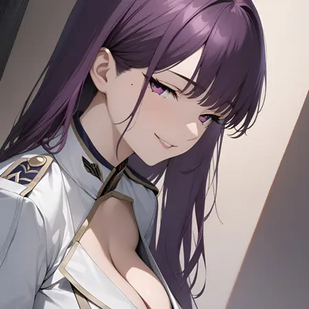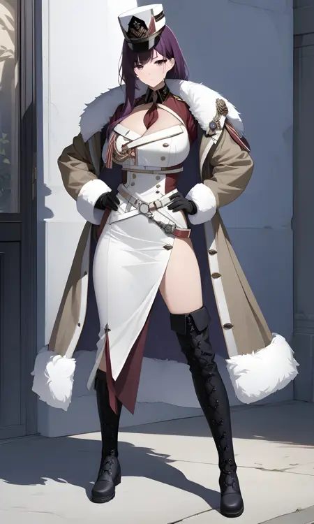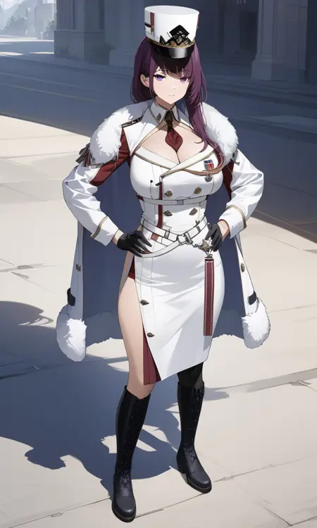 Activation tag is "felix(counterside), long hair, mole under eye, purple hair, purple eyes, large breasts", Outfit tag is "hat, gloves, necktie, white headwear, black gloves, fur trim, uniform, white cape, cleavage, white military uniform, military hat, white coat, black footwear, boots".