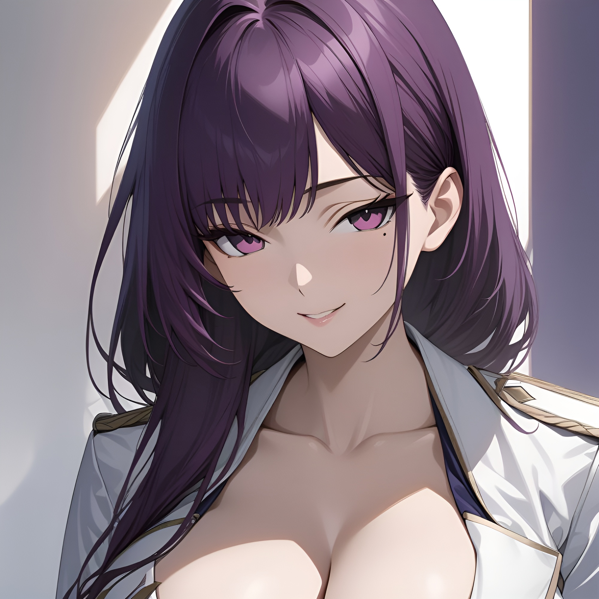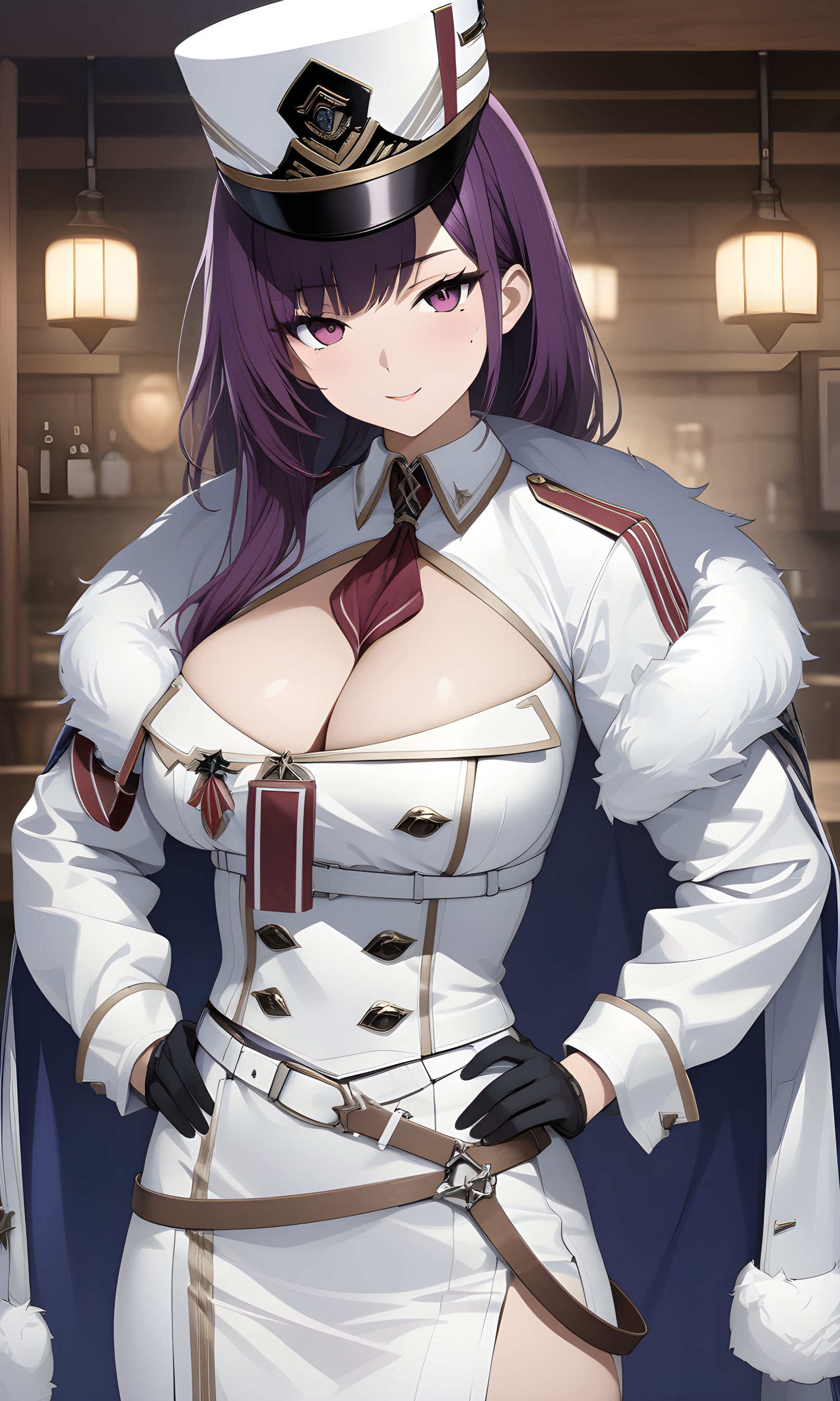 激活标签为:“felix(counterside), 长发, 眼下痣, 紫发, 紫眼, 大胸”,服装标签为:“帽子、手套、领带、白色头饰、黑色手套、毛皮镶边、制服、白色斗篷、露胸、白色军服、军帽、白色外套、黑色鞋履、靴子”。