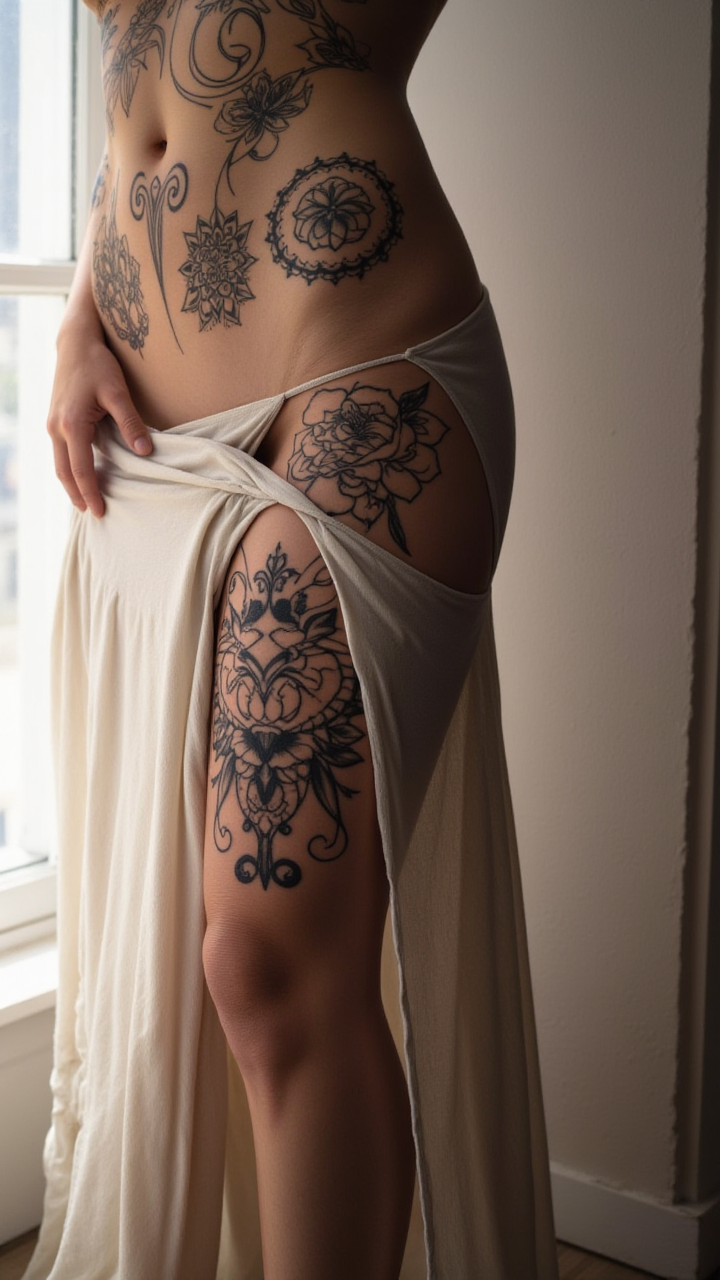 タトゥー入りの女性の下半身。抽象的な形状と花模様の詳細な黒インクタトゥー。長いフリルスカートを着用。明るい光が差し込む窓辺に立つ。顔や腕はなし。タトゥーの詳細と光の柔らかな動きに焦点。