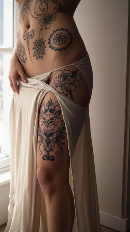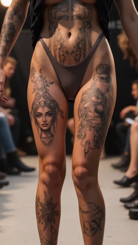 女性が片手を腰に当ててポーズをとり、腹部と太ももの複雑なタトゥーを強調する正面ビュー。