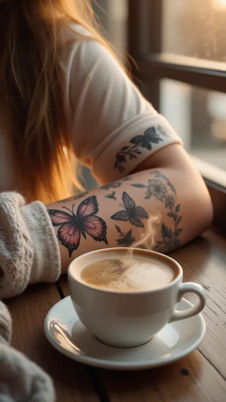 カフェのテーブルに置かれた女性の前腕のクローズアップ。ロールアップした袖の下から蝶と野生の花のタトゥーが覗く。目の前に蒸し上がるコーヒー。柔らかな黄金色の光が窓から差し込む。心地よくリラックスした雰囲気。タトゥーと環境に焦点。顔や肩はなし。