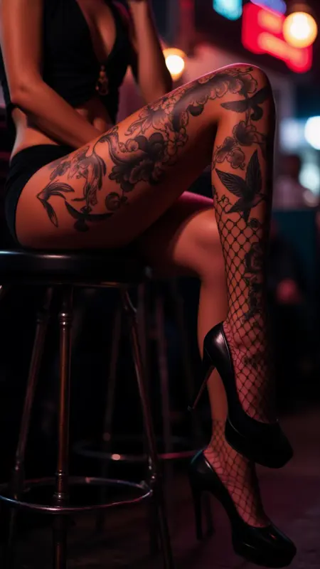 バーのスツールに足をのせた女性の脚のクローズアップ。太ももに鳥と雲の複雑なタトゥー。フィッシュネットストッキングとブラックヒールを着用。薄暗い照明。ダークな都市風景。背景にネオンライトの輝き。エッジの利いた反逆的な雰囲気。顔や手はなし。タトゥーと環境に焦点。