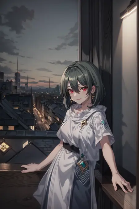 earrings, red eyes, dress, bangs, white dress, short sleeves, short hair, hair between eyes, grey green hair, (vita), black_high heeled low knee boots,