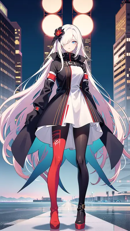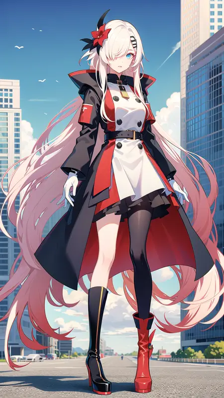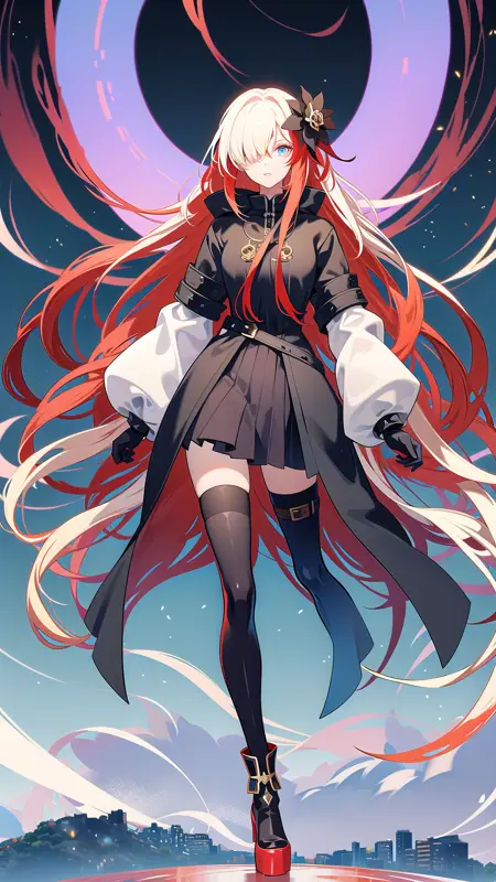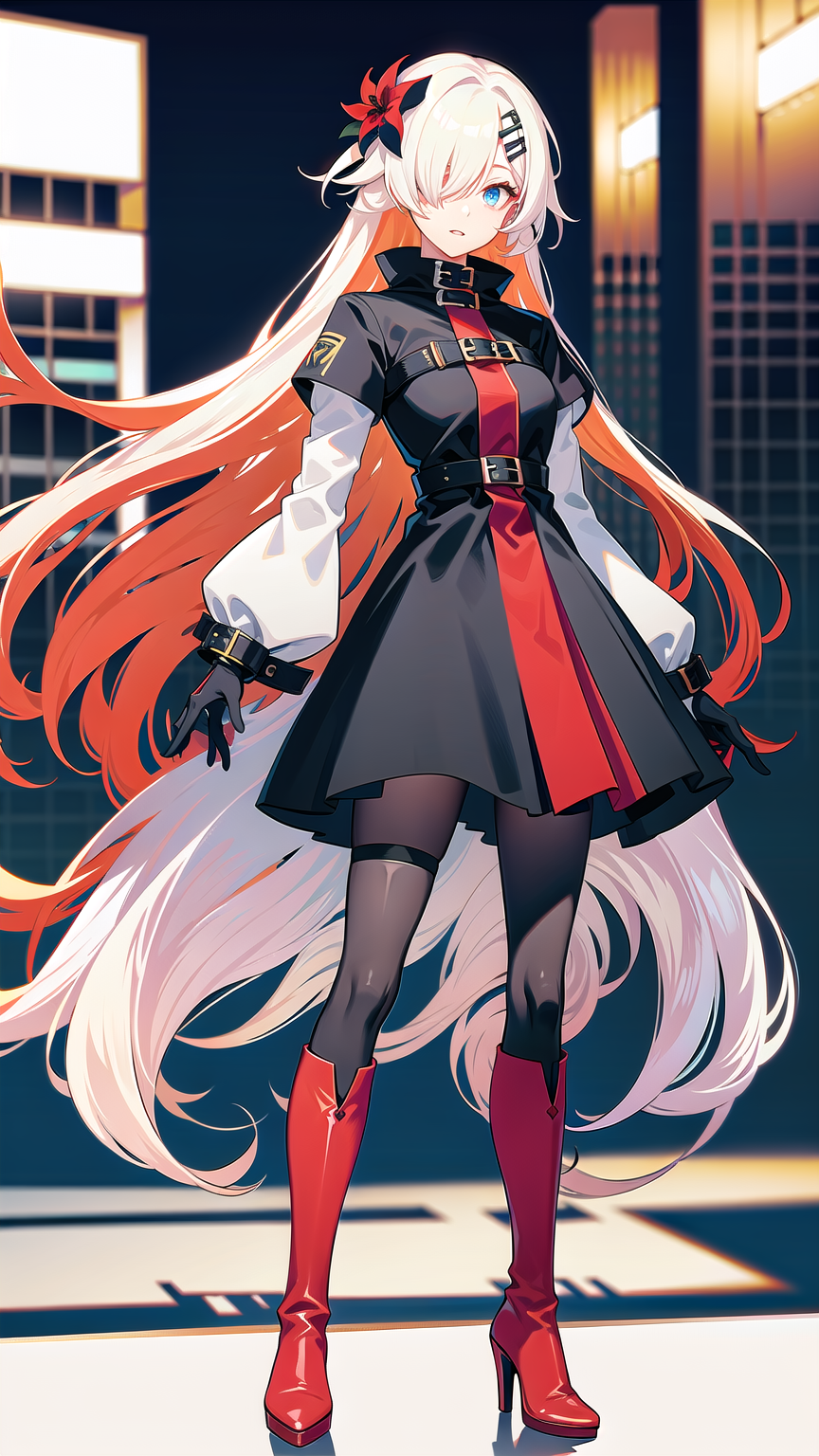 masterpiece, best quality, sekaicevio, 1girl, single glove, virtual youtuber, (full body:1.2), hair over one eye, boots, long hair, hair ornament, white hair, red hair, multicolored hair, blue eyes, high heels, gloves, coat, asymmetrical footwear, black coat, high heel boots, outdoors, asymmetrical sleeves, building, knee boots, looking at viewer, solo, asymmetrical legwear, red footwear, full body, socks, kneehighs, city, parted lips, sky, standing, uneven sleeves, pantyhose, two-tone hair, black gloves lora:SekaiCevioV1-000008:1