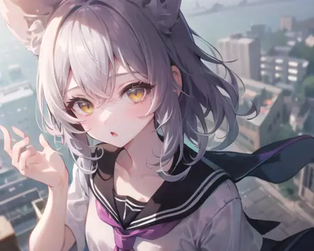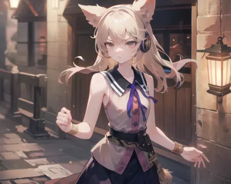 optional tags: purple earmuffs, purple skirt, small breasts, short hair, sandals, sleeveless shirt, yellow eyes
