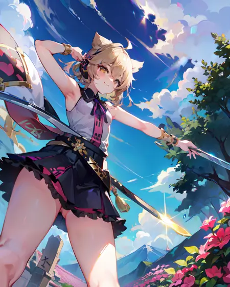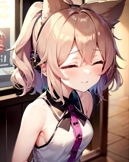 이어머프, 스커트, 작은 가슴, 짧은 머리, 샌들, 소매없는 셔츠, 노란 눈