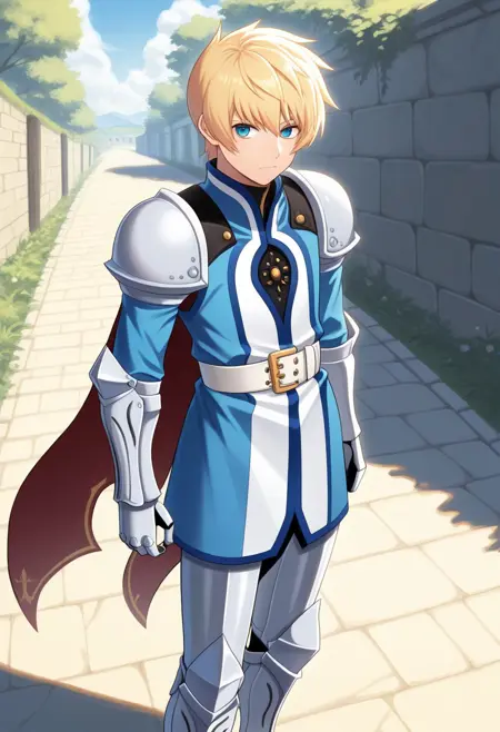 플린스키포, 1남자, 남성 중심, 혼자, 금발, 파란 눈, 갑옷, 서복, 허리띠, 흰색 허리띠, 망토, 장갑, 정강이 보호대,