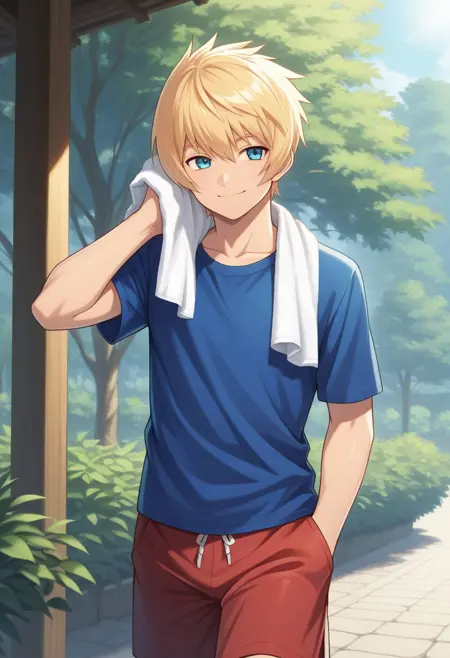 플린, 1남자, 남성 중심, 혼자, 금발, 파란 눈, 셔츠, 파란 셔츠, 높은 칼라, 긴 소매, 갑옷, 어깨 보호대, 장갑, 망토, 허리띠, 갈색 허리띠, 바지, 흰색 바지, 부츠,
