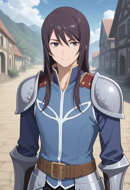 lowell, 1boy, male focus, solo, black hair, long hair, black eyes, shirt, blue shirt, high collar, armor, shoulder armor, gloves, belt, brown belt,