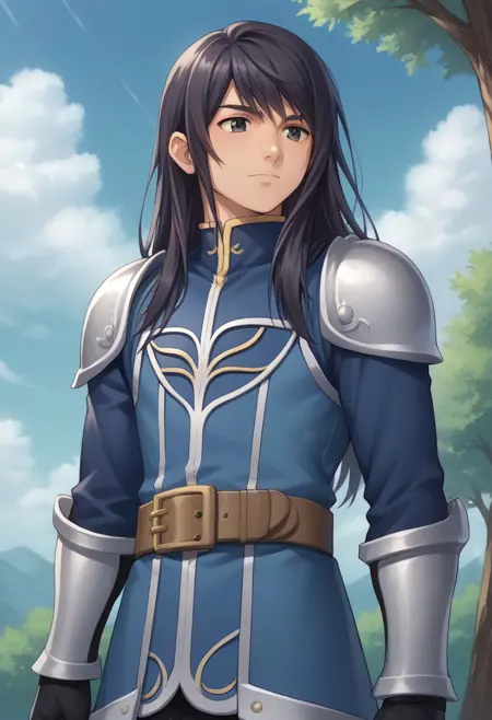 lowell, 1boy, male focus, solo, black hair, long hair, black eyes, shirt, blue shirt, high collar, armor, shoulder armor, gloves, belt, brown belt,
