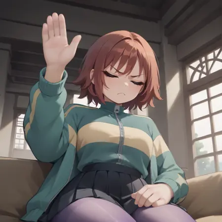 sitting, hand up, leaning on back, from below,