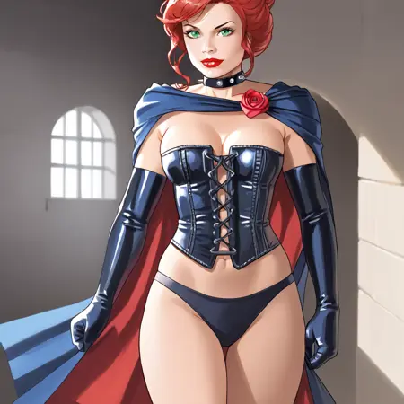 触发词:BlackQueen, 1girl, 黑色过膝袜, 肘部手套, 红发, 斗篷, 内衣, 大胸, 乳胶手套, 黑色内裤, 肚脐, 口红, 胸部露出, 单发髻, 胸衣, 妆容, 绿眼, 黑色手套, 露腹, 高开衩内裤, 玫瑰, 传统媒介