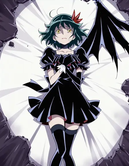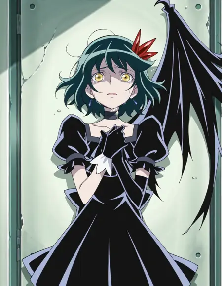 score_9, score_8_up, score_7_up, 1girl, solo, anime screencap, thighhighs, wings,single wing, blue eyes, green hair, short hair, gloves, bob cut, elbow gloves, black choker, dress, one eye closed, hair ornament, zettai ryouiki, bow, wrist cuffs lora:darkprecure:0.8
