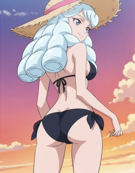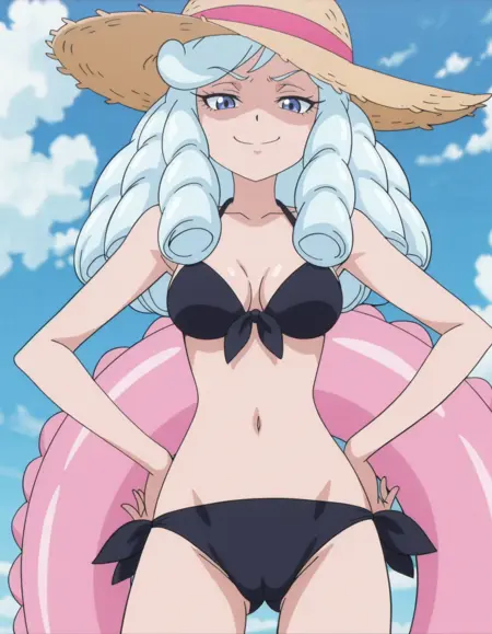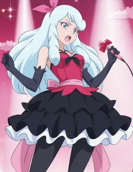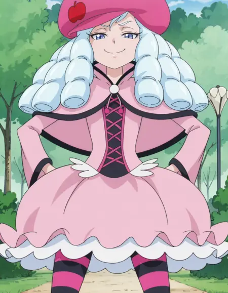 score_9, score_8_up, score_7_up, anime screencap, solo,1girl, pink headwear, light blue hair, full body, medium hair, smile, shoes, striped pantyhose, standing, ringlets, pink footwear, looking at viewer, pink dress, blue eyes lora:hosshiwa:0.8