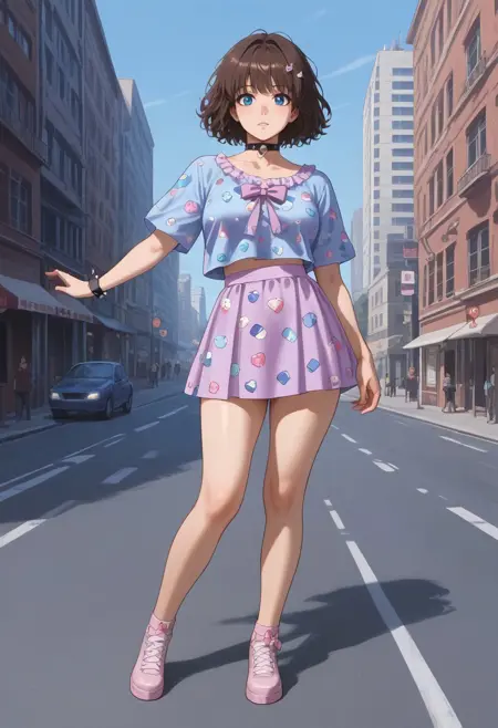yami_kawaii, (dark colors)++, oversized shirt, patterns, illustration on shirt, choker, platform shoes, loose socks,
