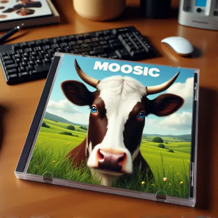 一张CD盒置于(物体)上的照片。CD盒上印有(主题)图像,标题为“(文本)”。图像背景显示(盒面细节)。主题化: