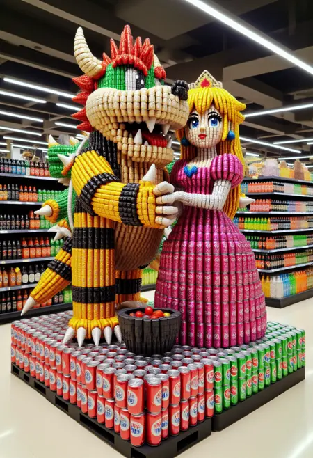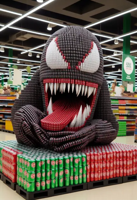 这是一张拍摄于光线充足、现代超市中的照片,焦点是一个由汽水罐完全构建而成的大型复杂雕塑,呈(主题/动作)形状,排列成精确而精细的图案。