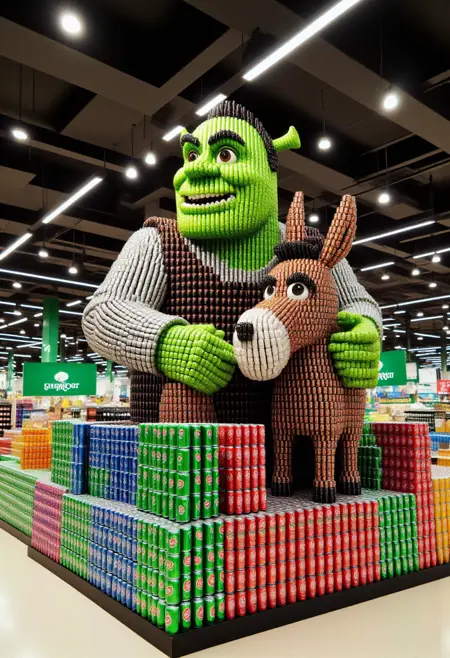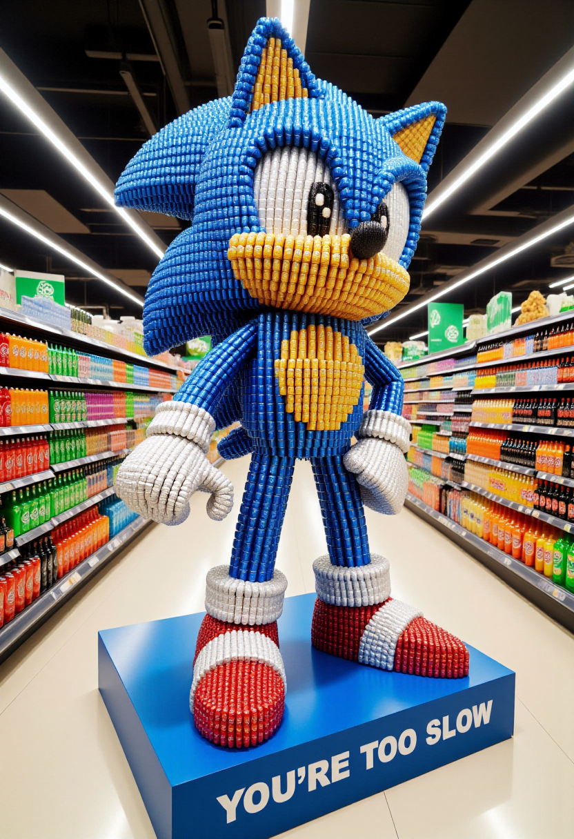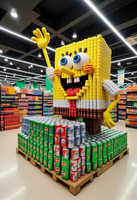 这张图是一张高分辨率照片,展示了一条光线充足的超市过道内精心创意的布置。中心是一个完全由汽水罐制成的、与实物等大的(主题/动作)模型。