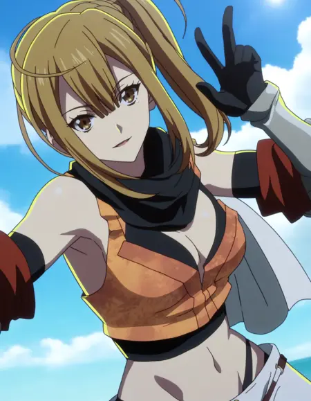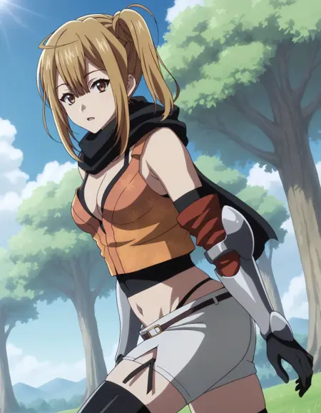 Since she always carries her sword sheath on her right shoulder while wearing her main outfit, that part of her outfit doesn't look very good. Adding shoulder pads, detached collar, rope, sword, katana in the negative prompts may help improve it.