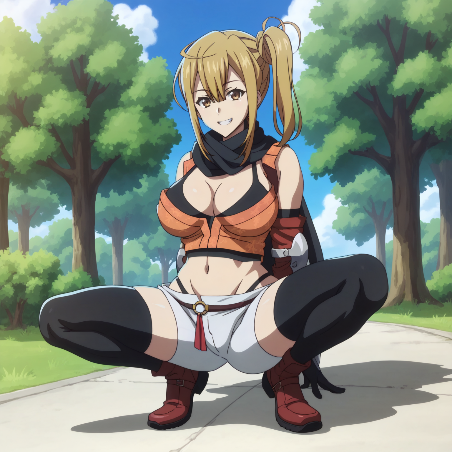 black scarf, cleavage, cropped vest, midriff, groin, highleg, white shorts, elbow gloves, arm guards