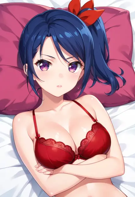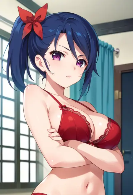 Hyouko Yundou, purple eyes, blue hair, side ponytail, short hair, hair ribbon,
