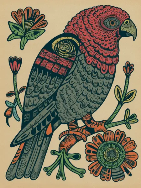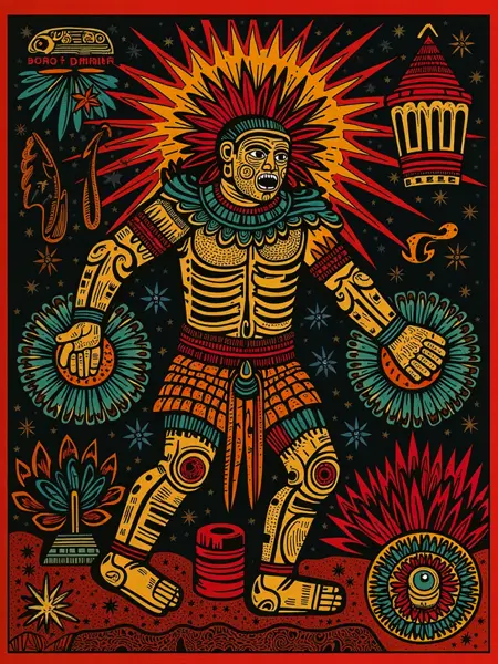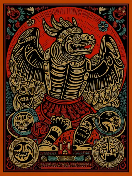 メキシコの民芸アートとコミック插画が融合。手書き文字、メソアメリカ神話、込み入ったポスター、花模様、動物、顔向きに適しています。足と風景にはあまり向きません。
