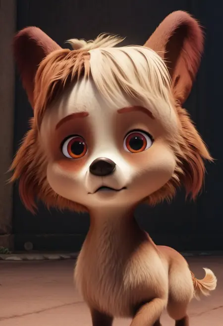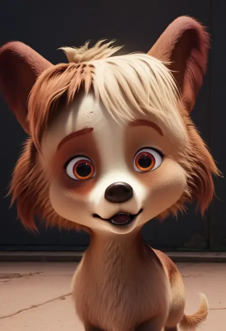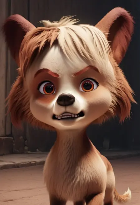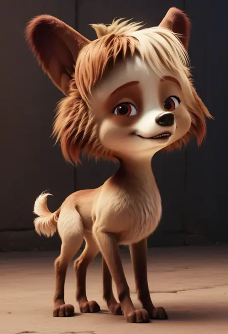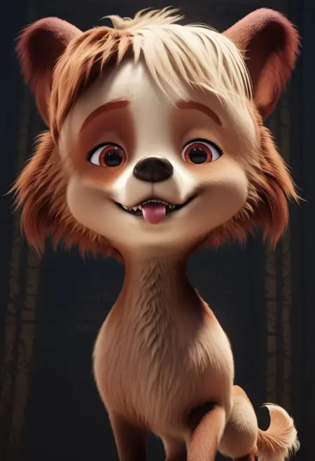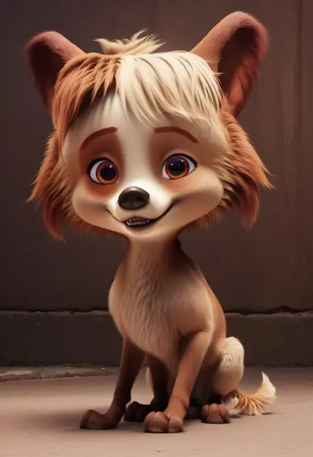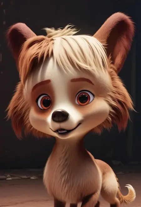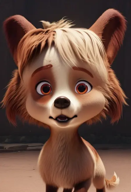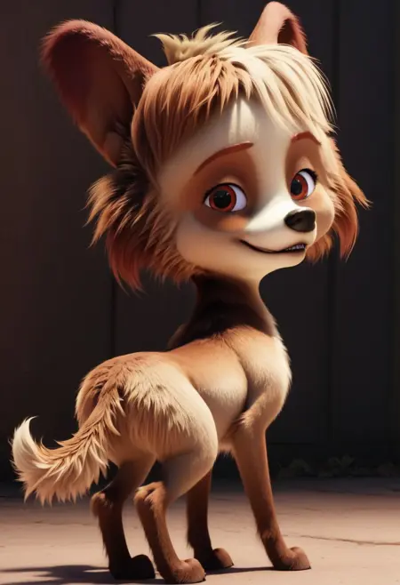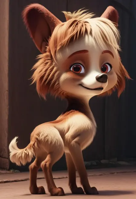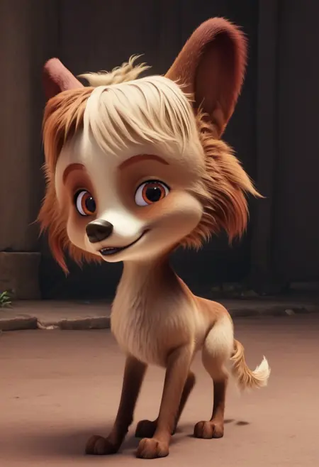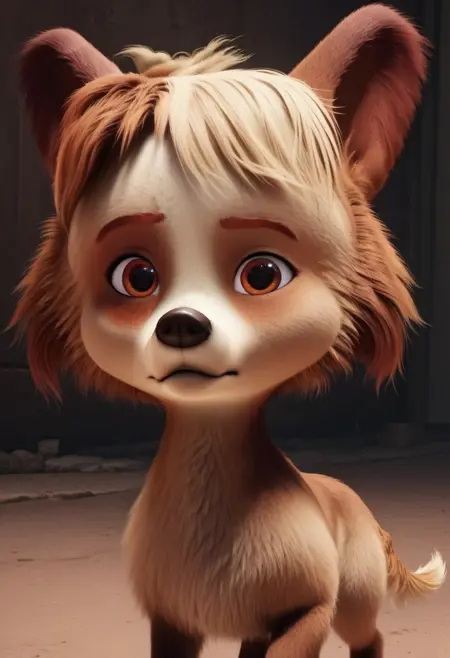 batty, 1girl, female dog, feral, small dog, tri-colored fur, golden tan with a lighter face and belly, one patch over each eye of a darker tan, brown ears, amber eyes, brown and blond hair, brown paws, golden tail, big head,