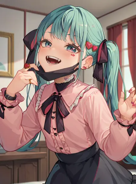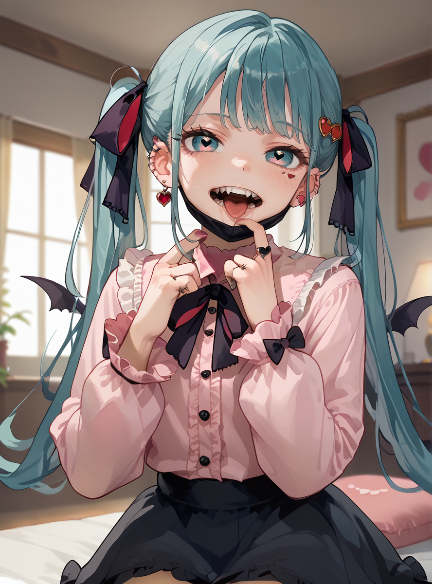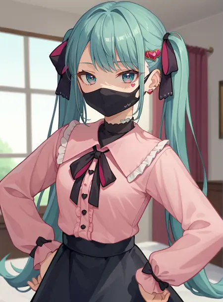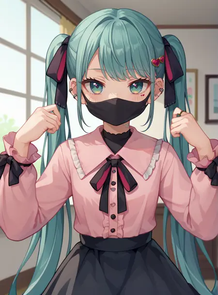 프롬프트: 1girl, twintails, solo, shirt, mask, skirt, (mouth mask), long hair, jewelry, heart hair ornament, ring, long sleeves, pink shirt bat_Wings